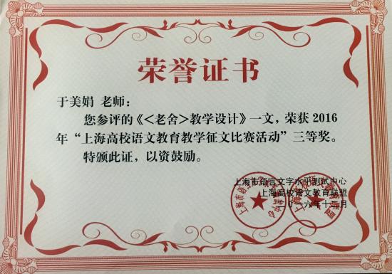 我校积极组织教师参加比赛。经评比,我校语言文化学院汉语国际教育专业教师于美娟的《<老舍>教学设计》获得三等奖。语言文化学院将继续强调教案质量的重要性,继续加强语文类课程建设,以全面提升全院师生的人文素养和语言文字应用能力,为实施素质教育、加强学校内涵建设做出积极贡献。