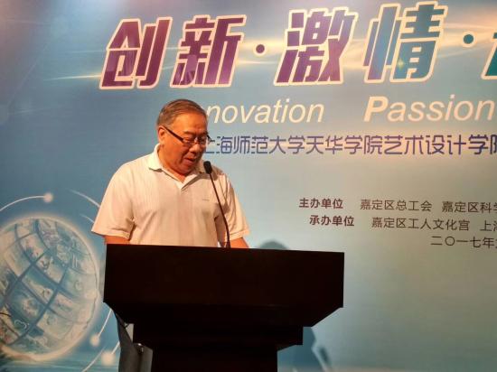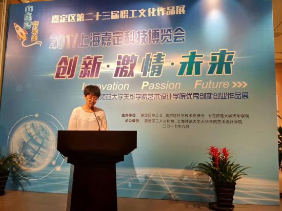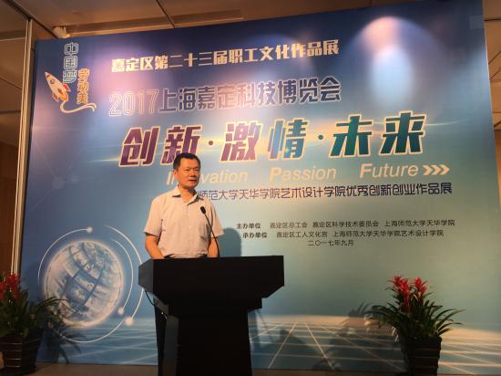 2017年9月18日下午, 2017上海嘉定科技博览会系列活动之一,“创新·激情·未来”我校艺术设计学院优秀创新创业作品展开幕式在嘉定区工人文化宫举行。嘉定区委副书记周金林,我校党委书记韩晓玉,区副巡视员陆晞,区科委主任陈蕴珠,区科委副主任金世珍,区总工会副处级干部龚英,我校艺术设计学院院长王大根,副院长朱花、徐子卿,以及师生代表等60多名人员出席本次活动。此次开幕式由区总工会党组书记、副主席金伟荣主持。