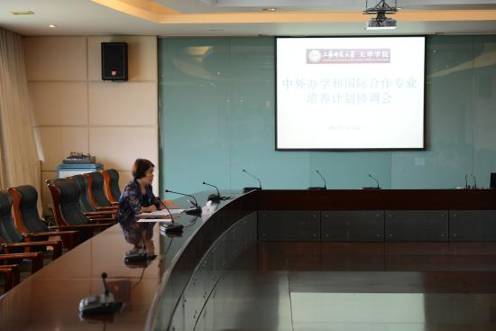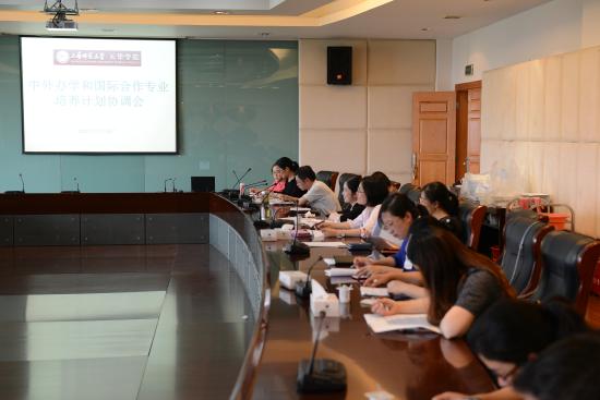 国际合作学院副院长、国际交流处处长胡珍首先对新拟定的《中外合作办学专业教学管理细则》进行了解读,重点讲解了国际合作项目(包括中外合作办学项目和双语课程合作项目)培养方案的制定原则、国际合作项目教学管理、通识课程教学管理以及师资培训的基本考虑,并结合我校学生语言学习实际,就今后合作项目学生的语言培训计划进行了汇报。教务处副处长王慧老师对培养方案的制订原则及学时学分的匹配等进行了说明。随后,参会者就培养方案、课程匹配、师资配备等具体问题进行了详细探讨,基本达成共识:一是要结合中外两校各自的办学优势,参照国际教育标准并充分考虑具体国情,共同制定合作办学专业的人才培养方案,以外语能力突出,掌握专业的基本理论、基本方法、基本技能和相关知识作为人才培养目标,重点培养能满足行业需求且具备国际化理念的高级别应用型人才。二是在课程设置上,中外合作办学项目将实行模块化、学分制管理,培养方案和课程教学大纲,由国际合作学院、相关院(系)和教务处根据专业人才培养的基本要求、我校及国外合作院校具体情况,在充分调研论证的基础上共同制定。三是在教学管理上,中外合作办学专业教学计划由二级学院负责具体实施;涉及外方课程的由国际合作学院(国际交流处)牵头,联合二级学院、教务处、外方共同制定,国际合作学院(国际交流处)作为对外联络部门与管理部门,负责项目的联络、申报、评估工作,负责与外方合作院校的协调与沟通等;国际合作学院负责通识教育部分(含与合作院校的学分互认课程以及国内的通识课程)以及出国语言培训的教学工作;二级学院负责专业课程(含专业基础课、专业必修课、专业选修课)的教学工作以及实习实训安排。外教专业课程部分由国际合作学院负责联络外教,由二级学院衔接具体教学安排。
