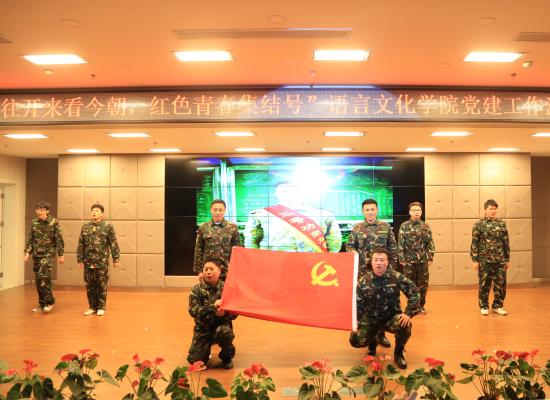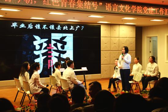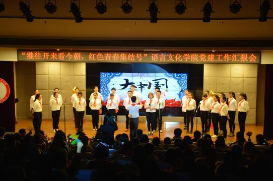 本次汇报会在合唱《大中国》中拉开序幕。无数革命先烈用鲜血和生命换来了祖国今日的和平与繁荣;作为当代青年学子,身上肩负的是祖国未来持续发展的光荣使命。在描绘祖国宏伟蓝图的歌声中,语言文化学院党总支书记孙超进行了本学期的党建工作汇报。孙书记从党建中心的发展讲起,着重介绍了本学期总支围绕建设学习型党组织、服务型党组织,弘扬社会主义核心价值观以及纪念抗战胜利70周年等四个大板块开展的各项工作,同时指明党建中心未来发展的方向。情景剧《那年那月》带着在场的师生共同追忆70年前抗战的艰辛与不易,演员们通过生动精彩的表演带着全场观众感受在民族危亡的时刻,每一位赤子英雄用肉体凡胎去承受枪林弹雨,只为家园故土不受摧残,展现了革命战士为自由、安宁与信仰不懈奋斗的精神。