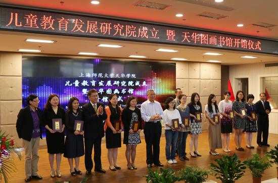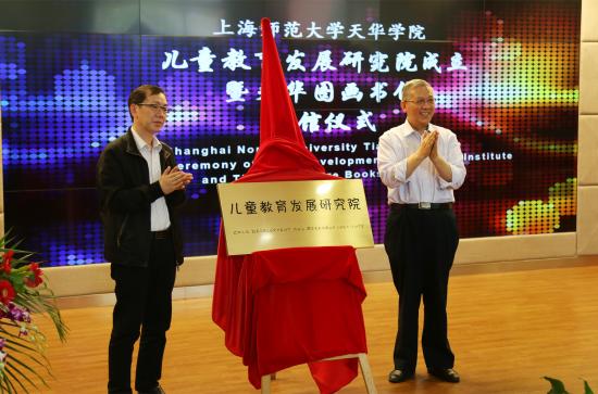 上海市教委高教处傅建勤处长,学校董事长邹荣祥为儿童教育发展研究院揭牌;上海新闻出版局出版管理处处长王莳骏先生,中国福利会出版社社长余岚女士为天华图画书馆揭牌。