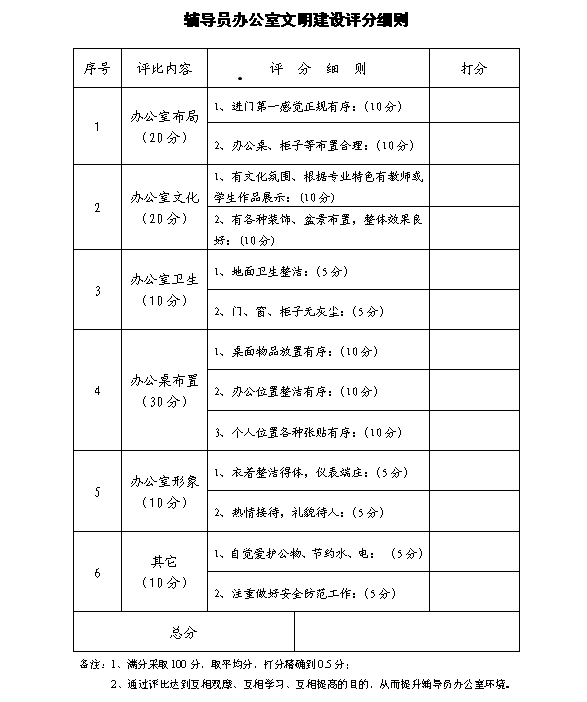 此次评比采取打分制,满分100分,评比项目包括办公室布局、办公室文化、办公室卫生、办公桌布置、办公室个人形象、办公室设施维护6个方面,13个评分细节。经过最终评选教育学院、艺术设计学院辅导员办公室荣获一等奖,工学院、管理学院辅导员办公室荣获二等奖,语言文化学院、健康学院辅导员办公室荣获鼓励奖。(学保处)