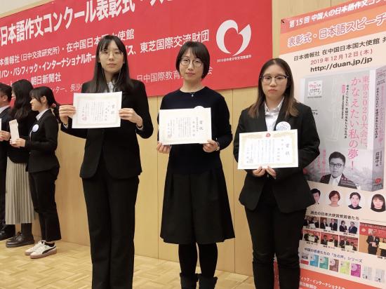 2019年12月12日,我校语言文化学院日语专业师生赴北京日本大使馆参加了第15届中国人日语作文大赛颁奖典礼暨演讲大会。全国共有来自208所学校的4359篇作文参赛,大赛共设大使奖1名,一等奖5名、二等奖15名,三等奖60名,佳作奖229名。本届大赛的作文主题有3个:东京2020年奥运会想实现的梦想、年轻人对中日新时代的思考、我的老师/家人/朋友。学生从中选取1个主题进行作文撰写,字数要求在1500-1600字。