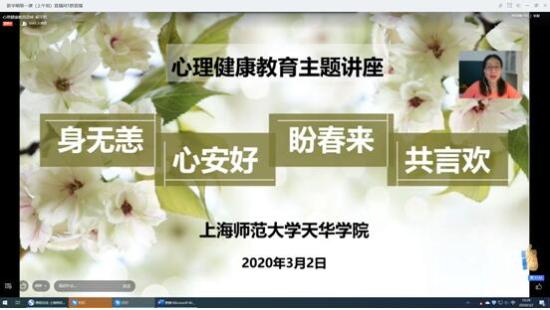 根据教育部指导意见和上海市教委工作要求,依照《上海师范大学天华学院2020年春季学期教育教学工作方案》,3月2日起,学校2020年春季学期527门课程的在线教学陆续启动。当天,健康学院刘敏老师和杨宇然老师,面向全校259个行政班9400余名学生线上开讲“新学期第一课”,分别从医学和心理学角度传授疫情防控知识。