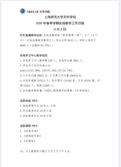 截至3月2日下午4点,学校发布的首日《全校网课日志》显示,在线直播课程“新学期第一课”,信号稳定,直播顺利,学生实际上线率达到91.47%。超星在线学习中心在线教师数238人,在线学生数4861人。学生学习访问终端占比Android(47.98%),iOS(37.29%),PC(14.73%),当日访问量39021次。