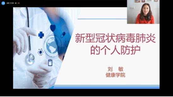 随后,第一个20分钟,健康学院刘敏老师带来专题讲座《新型冠状病毒肺炎的个人防护》。在接到“新学期第一课”教学任务后,刘敏老师在课程内容方面连夜备课、反复打磨,凭借其扎实的主治医师行业背景,从新冠肺炎的流行性、戴口罩和勤洗手、居家防控,以及返校返岗注意事项四个方面,深入浅出地给予了讲解和示范。