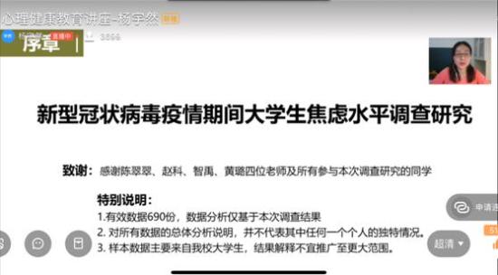 新学期第一课的第二讲由健康学院应用心理学专业杨宇然老师带来心理健康主题教育,分为战疫篇、调适篇和成长篇。杨老师以疫情期间面向天华学院大学生所做的“焦虑情绪及应对方式”调研结果为切人点,结合心理学专业知识,分析了如何应对疫情带来的恐慌情绪,如何调整状态,激发高效能自我,迎接在线学习。