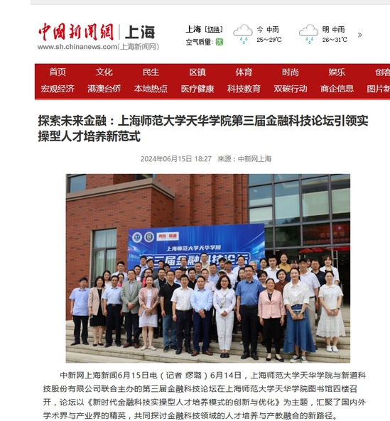 中新网 | 探索未来:上海师范大学天华学院第三届金融科技论坛引领实操型人才培养新范式来源:中新网上海2024年06月15日标题:探索未来金探索未来金融:上海师范大学天华学院第三届金融科技论坛引领实操型人才培养新范式融:上海师范大学天华学院第三届金融科技论坛引领实操型人才培养新范式记者:缪璐中新网上海新闻6月15日电(记者 缪璐)6月14日,上海师范大学天华学院与新道科技股份有限公司联合主办的第三届金融科技论坛在上海师范大学天华学院图书馆四楼召开,论坛以《新时代金融科技实操型人才培养模式的创新与优化》为主题,汇聚了国内外学术界与产业界的精英,共同探讨金融科技领域的人才培养与产教融合的新路径。 论坛由商学院院长程葆青主持,上海师范大学天华学院校长叶才福在开幕致辞中强调了大数据与人工智能时代下,实操型人才对于推动技术进步和产业发展的重要性。随后,上海师范大学经济与教育大数据研究中心主任束金龙,曾任上海市教育委员会高教处处长,分享了应用型本科高校金融人才培养如何更好地服务于国家发展大局,提出在数智时代背景下,应用型本科高校如何培养高质量的金融人才,应从学科交叉融合、提升教师科研教学能力、加强人工智能基础知识学习、深度产教融合、做实做深见习实习和实践、完善教育评价改革等方面全2024-06-20 -