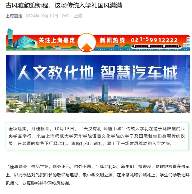 上海嘉定 | 古风雅韵迎新程,这场传统入学礼国风满满金秋送爽,丹桂飘香。10月15日,“天汉有礼 师道中华”传统入学礼在位于马陆镇的未央学宫举行。来自上海师范大学天华学院语言文化学院的学子及国际新生们身着传统汉服,在老师的指导下行释菜礼、束脩礼和训诫礼,踏上了一场古风雅韵的入学之旅。“谨尊师令,恪尽学业。修身正己,自强不息。”释菜礼始,新生们手捧香芹,恭敬地放置在供案上,以此表达对先贤师长的敬仰与追思,敬中华文明之源。在束脩礼和训诫礼上,学生们恭敬地拜见师长、认真聆听并学习校风校训。入学礼学生代表、新生郭玉阳收获颇丰:“孔子有言:‘不学礼,无以立。’此次活动不仅加深了我对中华传统文化的领悟,也让我对专业课知识有了更多了解。比如在入学礼中,我们手中捧着的香芹代表着‘青年学子’的意思。”仪式上,国际新生们虽是初次学习,但在老师的悉心引导下,举手投足间尽显对中华传统文化的尊重。吉尔吉斯斯坦留学生Nurzada曾去过山东曲阜——孔子的家乡,在那里她了解了不少中华传统文化。“今天穿上汉服,参加这场庄严的仪式,又让我产生了相似的感觉,也坚定了我继续深入学习中华文化的决心。”Nurzada说。活动中,上海师范大学天华学院语言文化学院院长陈再阳向全体新2024-10-16 -