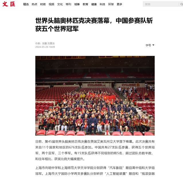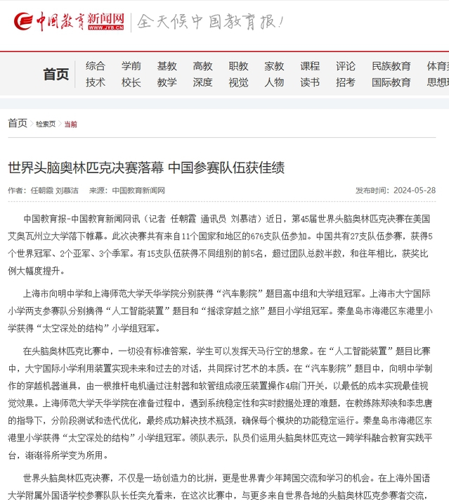 中国教育新闻网 | 世界头脑奥林匹克决赛落幕 中国参赛队伍获佳绩来源:中国教育新闻网 2024年5月28日标题:世界头脑奥林匹克决赛落幕 中国参赛队伍获佳绩记者:任朝霞 刘慕洁近日,第45届世界头脑奥林匹克决赛在美国艾奥瓦州立大学落下帷幕。此次决赛共有来自11个国家和地区的676支队伍参加。中国共有27支队伍参赛,获得5个世界冠军、2个亚军、3个季军。有15支队伍获得不同组别的前5名,超过团队总数半数,和往年相比,获奖比例大幅度提升。上海市向明中学和上海师范大学天华学院分别获得“汽车影院”题目高中组和大学组冠军。上海市大宁国际小学两支参赛队分别摘得“人工智能装置”题目和“摇滚穿越之旅”题目小学组冠军。秦皇岛市海港区东港里小学获得“太空深处的结构”小学组冠军。在头脑奥林匹克比赛中,一切没有标准答案,学生可以发挥天马行空的想象。在“人工智能装置”题目比赛中,大宁国际小学利用装置实现未来和过去的对话,共同探讨艺术的本质。在“汽车影院”题目中,向明中学制作的穿越机器道具,由一根推杆电机通过注射器和软管组成液压装置操作4扇门开关,以最低的成本实现最佳视觉效果。上海师范大学天华学院在准备过程中,遇到系统稳定性和实时数据处理的难题,在教练陈郑泱和李忠唐的指导下,2024-05-28 -