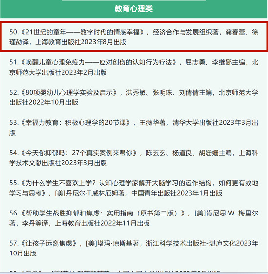 中国教育新闻网 | 龚春蕾译著《21世纪的童年》获评中国教育新闻网2023年度“影响教师的100本书”“教育心理类”TOP12023-12-27 -