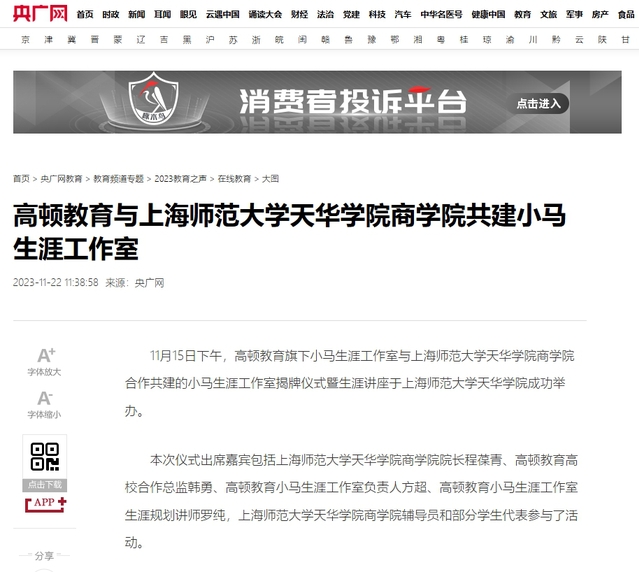 央广网 | 高顿教育与上海师范大学天华学院商学院共建小马生涯工作室标题:高顿教育与上海师范大学天华学院商学院共建小马生涯工作室11月15日下午,高顿教育旗下小马生涯工作室与上海师范大学天华学院商学院合作共建的小马生涯工作室揭牌仪式暨生涯讲座于上海师范大学天华学院成功举办。本次仪式出席嘉宾包括上海师范大学天华学院商学院院长程葆青、高顿教育高校合作总监韩勇、高顿教育小马生涯工作室负责人方超、高顿教育小马生涯工作室生涯规划讲师罗纯,上海师范大学天华学院商学院辅导员和部分学生代表参与了活动。党的十九届五中全会提出2035年建设教育强国的远景目标,明确“十四五”时期“建设高质量教育体系”的工作任务,为了更好地适应国内外经济发展需求,建设高质量大学生职业生涯发展教育体系,作为高校在大学生教育培训领域多年的合作伙伴,——高顿教育以旗下品牌「小马生涯工作室」为主体,推出共建方案。(机构供图,央广网发)会上,由上海师范大学天华学院商学院院长程葆青进行致辞。程院长就当前大学生面临的求职形势进行讲解,以自身事例启发并帮助现场的每一位同学深刻理解了提前制定职业规划的必要性。(机构供图,央广网发)随后,高顿教育小马生涯工作室负责人方超详细解读了双方未来合作的规划。方老师表示,2023-11-22 -
