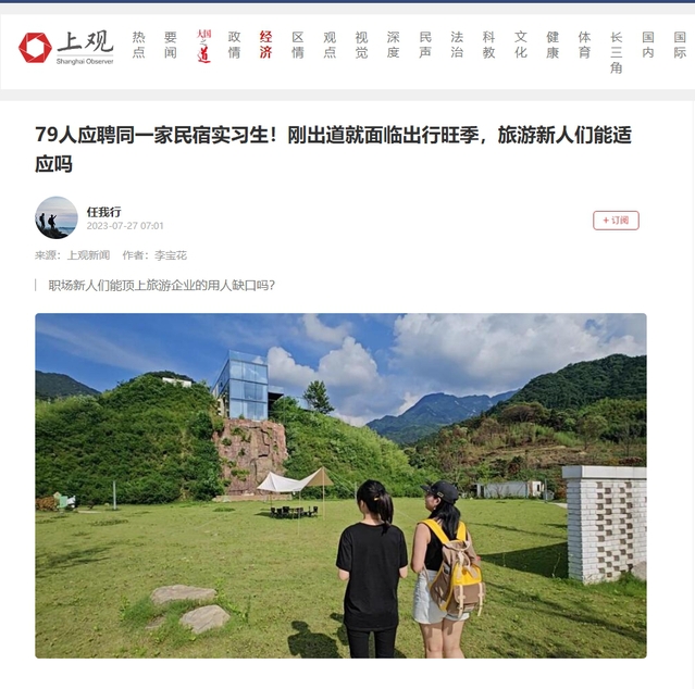 上观新闻| 79人应聘同一家民宿实习生!刚出道就面临出行旺季,旅游新人们能适应吗来源:上观新闻 2023年07月27日标题:79人应聘同一家民宿实习生!刚出道就面临出行旺季,旅游新人们能适应吗记者:李宝花暑期出游热潮方兴未艾,一批走出校门的大学生成为旅游市场的新生力量。他们中有的是为了增加阅历而实习的大三学生,也有刚刚踏上工作岗位的应届毕业生。过去三年间,不少旅游企业经历了人才流失及裁员,暑期正面临人手紧缺局面。这些初出茅庐的大学生们,能补上旅游企业的人力缺口吗?1/79的民宿实习生今年6月中旬,天津大学建筑学院2019级本科生何苗,成为一名“暑期新农人”。何苗读的是5年学制的城乡规划专业,暂时不急着找工作。得知携程度假农庄招实习生,她当即投了简历:“我知道这是一个典型的乡村振兴项目,和我学的专业关联度很高,很期待实地感受一下这类项目的具体运作”。实习前20多分钟的电话面试中,农庄店长提醒了何苗不下三次:“你来这里会比较辛苦,扫地、擦桌子的事情都要做,和你想象中的实习可能不太一样。”何苗很坚定:“我不歧视任何职业,扫地、擦桌子也不丢人,我能接受。”后来她才知道,店长收到的实习应聘简历共有79份,她是唯一入选者。6月20日,何苗拎着箱子来到农庄。这里名为农庄,实则是2023-07-27