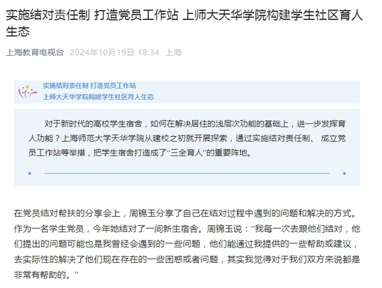 上海教育电视台 | 实施结对责任制 打造党员工作站 上师大天华学院构建学生社区育人生态来源:上海教育电视台 2024年07月31日标题:实施结对责任制 打造党员工作站 上师大天华学院构建学生社区育人生态在党员结对帮扶的分享会上,周锦玉分享了自己在结对过程中遇到的问题和解决的方式。作为一名学生党员,今年她结对了一间新生宿舍。周锦玉说:“我每一次去跟他们结对,他们提出的问题可能也是我曾经会遇到的一些问题,他们能通过我提供的一些帮助或建议,去实际性的解决了他们现在存在的一些困惑或者问题,其实我觉得对于我们双方来说都是非常有帮助的。”周锦玉上海师范大学天华学院学生像这样的党员结对帮扶活动,每周都会进行一次。在上海师范大学天华学院,所有的学生党员和入党积极分子都会参与到党员结对责任制工作当中。既帮助同学们解决实际困难,在学业、生活等方面取得成长、获得进步,同时也帮助学生党员提升自身党性修养和综合素质。除了发挥朋辈作用来加强学生们自我管理能力,传递正确的思想观念和价值选择。上海师范大学天华学院还建立了两支辅导员队伍,一支专职辅导员队伍,一支由退役士官组成的副辅导员队伍。两支辅导员队伍形成在上下班时间上互相衔接,工作内容上互相配合,构成对学生全天候、全方位的教育和管理。张子璠上海师范2024-10-19 -