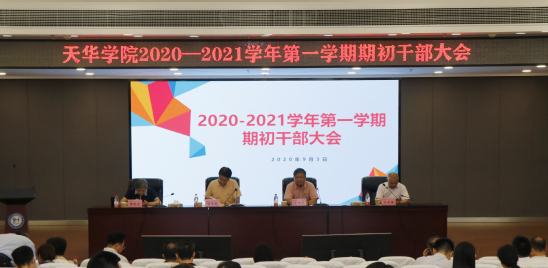 学校召开2020-2021学年第一学期期初全校干部大会9月3日上午,学校在晖华楼报告厅召开2020-2021学年第一学期期初全校干部大会,学校党政监领导班子、中层干部、助理以及党总支正副书记参加会议。会议由执行董事长石伟平主持。石伟平首先向假期依旧奋斗在工作岗位的教职员工表示了感谢,随后代表董事会提出了新学年工作纲要。石伟平指出,今年是学校建校15周年,也是上一轮五年发展计划的收官之年,更是站在新起点展望未来发展的起航之年。面对国内外高等教育发展的新形势和新要求,学校将以“三化九点”为目标,着力提升干部教师实力,增强优势专业特色,实施智慧校园管理,建设学前智能示范基地,加快产学研联动,规划未来五年发展,推动学校的国际化、智能化、产业化三化联动,将天华事业篇章谱写的更加精彩。党政监领导分别解读了本学期的工作要点。党委书记陆建非从严控疫情,发挥组织堡垒作用;党建领航,服务学校内涵建设;思政铸魂,提升立德树人水平;人才强基,激发师资队伍活力;学生为要,促进全面健康发展五个方面详细介绍了本学期学校党委在疫情防控、党建教育、思政改革、师资建设、学生工作等方面的重要举措,注重实际,务求实效,健全“三圈三全十育人”体系,以优异的成绩庆祝建校15周年,迎2020-09-03