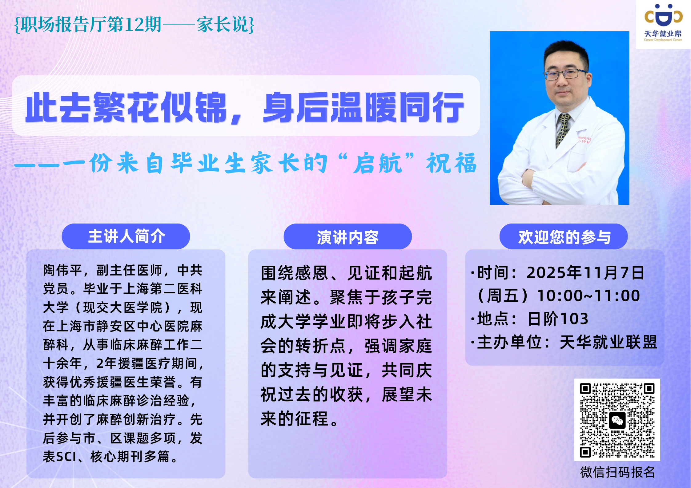 职场报告厅第12期——家长说:此去繁花似锦,身后温暖同行—— 一份来自毕业生家长的“启航”祝福 主讲家长:陶主讲人:陶伟平