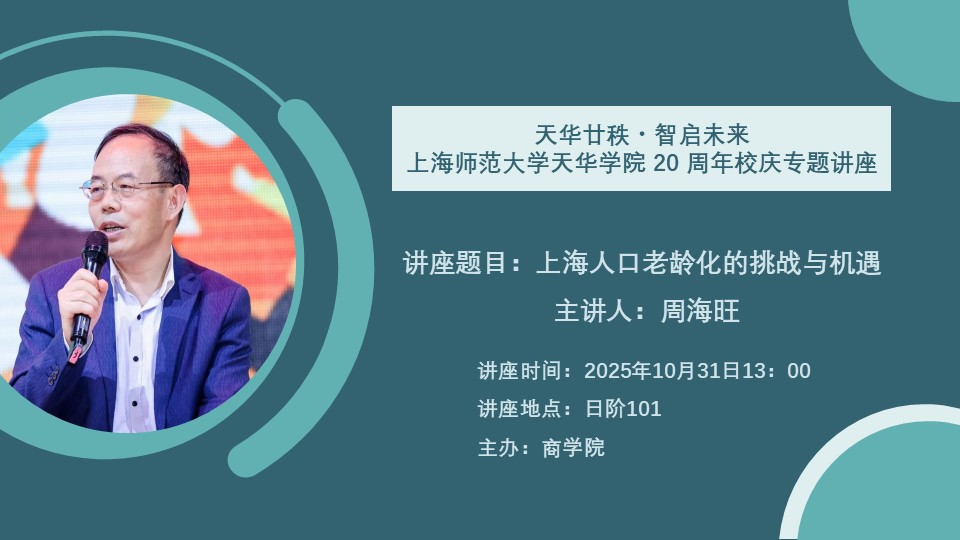 天华廿秩・智启未来 上海师范大学天华学院 20 周年校庆专题讲座:上海人口老龄化的挑战与机遇主讲人:周海旺