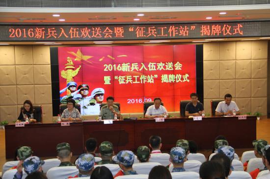 学校隆重举行新兵入伍欢送会暨征兵工作站揭牌仪式2016年9月20日下午13时,我校武装部在晖华楼小剧场隆重举行2016年新兵入伍欢送会暨征兵工作站2016-09-21