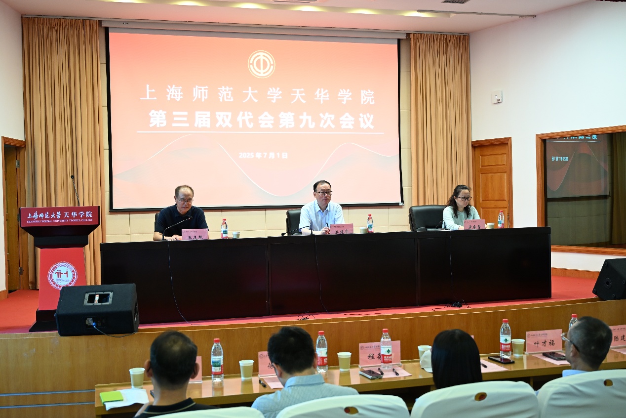 学校召开第三届双代会第九次会议7月1日,学校在明华楼5楼报告厅召开第三届双代会第九次会议,本次会议聚焦学校发展关键议题,凝聚教职工智慧与力量,为学校长远发展奠定坚实基础。学校党委书记高建华、总校监叶才福、顾问委员会主任郭伟奇、监事长陆建非、常务副校长龚春蕾等领导出席会议。会议由工会主席王友根主持。本次会议应到代表81人,实到64人,到会代表超过代表总数的三分之二,符合会议程序要求。会议审议并举手表决通过《上海师范大学天华学院2024年学校工作报告》《上海师范大学天华学院2024年学校财务工作报告》《上海师范大学天华学院工会经济审查委员会2024年工作报告》《上海师范大学天华学院调研员职级管理办法(讨论稿)》,审议并票决通过《上海师范大学天华学院教师教学工作量计算办法(2025版)》。党委副书记、常务副校长龚春蕾在2024年学校工作报告中总结了学校以办学质量评估和硕士学位点培育建设为引领,以推进专业转型调整、落实立德树人育人举措为主要抓手,在教学科研、师资建设、学生管理、资产财务、国际合作等领域所取得的成绩和进步,并分析了在专业转型与产业升级、高水平科研成果及高层次人才引领作用、产教融合深度与成果转化实效性等方面存在2025-07-02