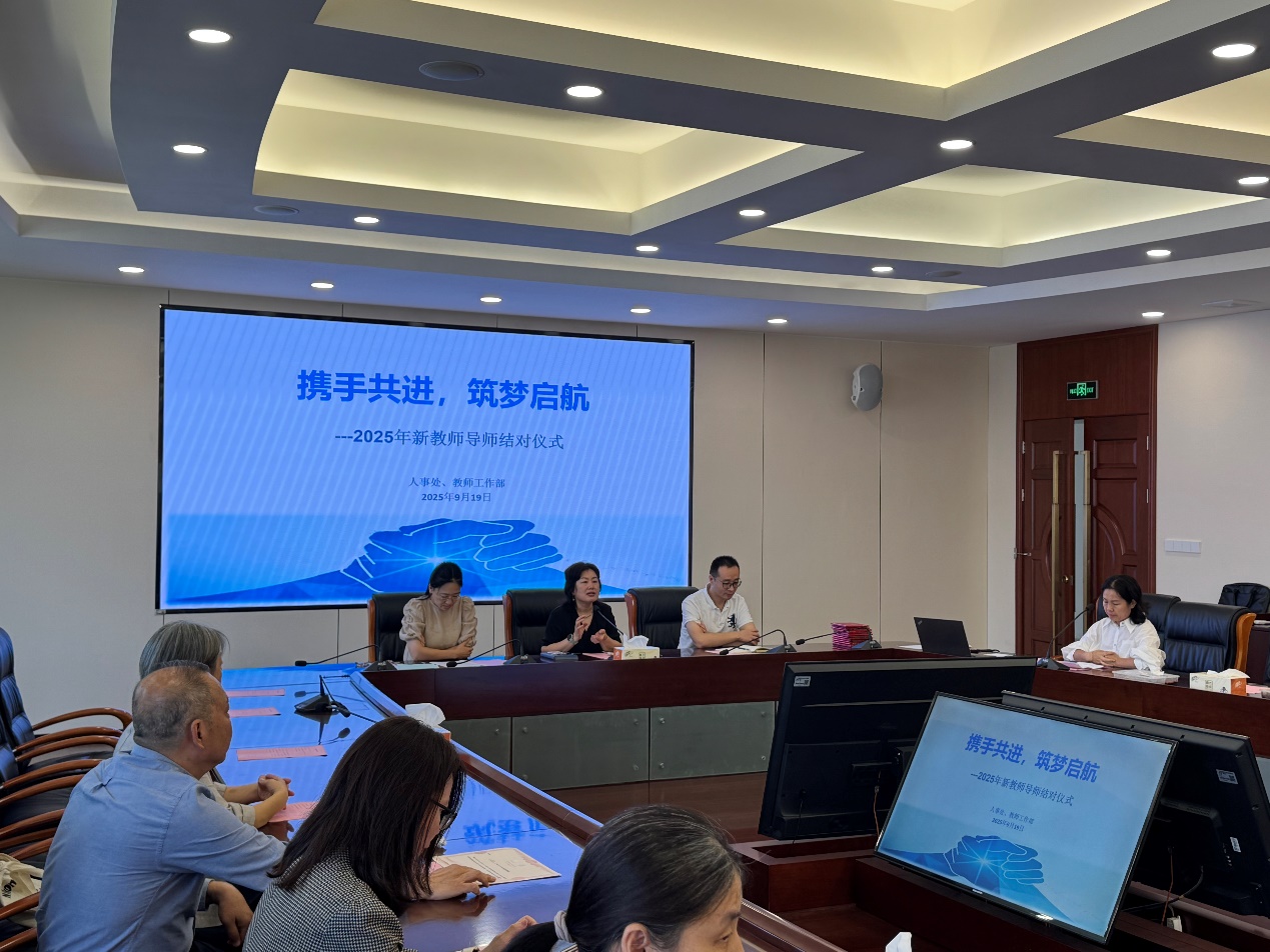 携手共进,筑梦启航——我校隆重举行2025年新教师导师结对仪式为助力新教师快速融入学校环境、提升教育教学能力,充分发挥骨干教师的“传、帮、带”作用,9月19日中午,“携手共进,筑梦启航——2025年新教师导师结对仪式”在明华楼五楼会议中心隆重举行。校长助理、人事处处长、教师工作部部长滕薇,教务处处长、数智处处长徐振,教师工作部常务副部长、人事处副处长王茜,各二级学院教学院长、受聘导师及全体新教师共同出席了仪式。仪式由教师工作部副部长李艳艳主持。滕薇处长首先详细解读了本次新教师培训的总体方案设计。她强调,学校高度重视教师队伍特别是新教师的培养与发展,本次系统化、个性化的培训方案旨在为新教师的职业起步奠定坚实基础,助力其快速完成角色转变,成长为符合学校发展要求的高素质专业化教师。(校长助理、人事处处长、教师工作部部长滕薇老师发言)教师工作部常务副部长、人事处副处长王茜就新教师常态化培训的具体内容进行了介绍。她表示,培训将贯穿整个学年,涵盖师德师风、教学规范、科研入门、信息技术应用等多个模块,通过系列讲座、工作坊、教学观摩等形式,持续为新教师成长提供支持与养分。(教师工作部常务副部长、人事处副处长王茜老师发言)人事处、教务处领导为受聘导师们逐一颁发聘书2025-09-22