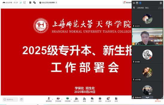 学保处召开2025级专升本、新生辅导员工作线上部署会为提前统筹2025级专升本及新生入学相关工作,明确各环节职责与要求,确保后续迎新、管理及服务工作的有序推进,学保处于2025年8月29日10:00在月270召开2025级专升本、新生辅导员工作线上部署会。招生办主任包静波、学保处处长刘洪伟、学保处副处长杨央、冯建刚,二级学院党总支书记及全体2025级专升本、新生辅导员参会。会议由学保处处长刘洪伟主持。会上,招办主任包静波首先通报了2025级新生招生工作的总体情况,通过对今年招生数据、生源分布及专业报考趋势的详细分析,为后续工作开展提供了数据支撑与方向指导。包主任强调,新生辅导员须尽快熟悉学生信息,有序开展电话联系及温馨提示发放工作,传递学校对新生的关怀与重视。此外,他还就专升本报到环节中的毕业证书钉钉线上核验流程作了详细说明,要求相关人员严谨操作,确保核验准确无误,保障专升本学生顺利报到。学保处副处长杨央就上海生源新生家访工作进行了全面部署和深入解读。她指出,家访是家校协同育人的重要纽带,各学院应切实提高认识,准确把握工作要求,制定周密计划,力争在新生入学前初步了解学生情况、成长背景、家长期望与潜在困难,建立好沟通渠道并介绍学校概况、育2025-09-01